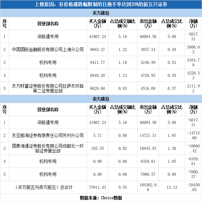 今日龙虎榜单上出现了深股通的身影,占据了买一、卖一的位置,净卖出5017.31万元,占当日成交总额的0.63%。