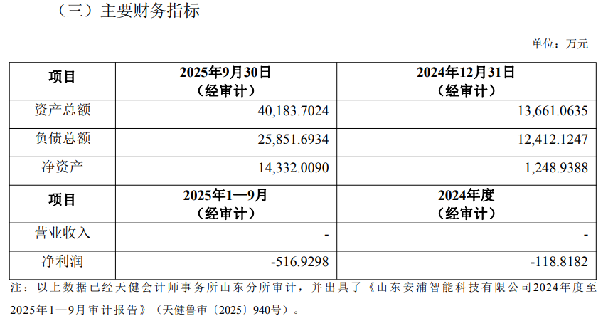 标的公司财务数据方面,从资产结构看,安浦智能2025年9月末资产总额4.018亿元,负债总额2.585亿元,净资产1.433亿元。安浦智能2024年、2025年前三季营收均为零,净利润分别亏损119万元、517万元。
