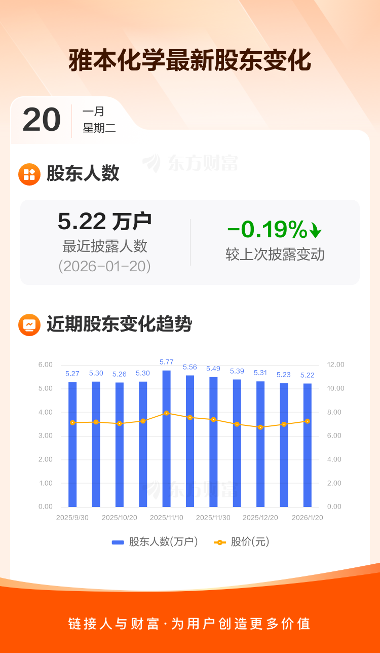 雅本化学:截至1月20日最新股东户数5.22万户,较上期减少0.19%