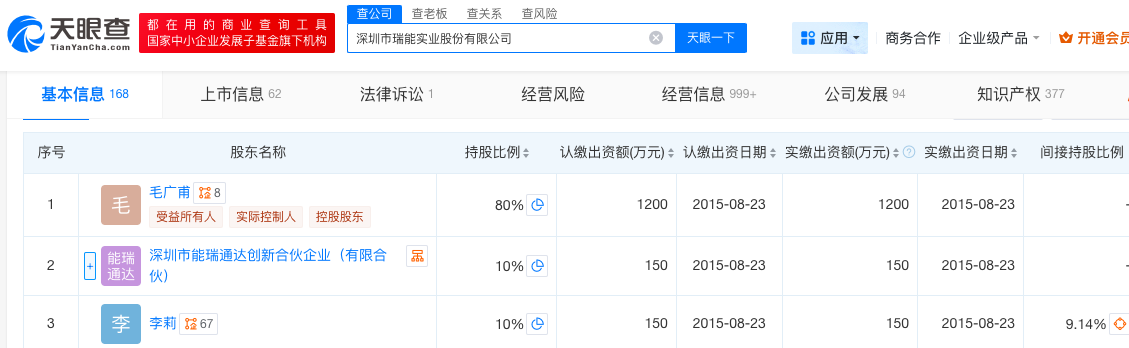 天眼查信息显示,李莉、毛广甫夫妇名下核心资产为深圳市瑞能实业股份有限公司(以下简称“瑞能股份”)。瑞能股份成立于2003年,主营业务为锂电池检测设备及锂电池后段生产线的研发、设计、生产和销售,产品主要应用于动力电池、3C数码电池等。