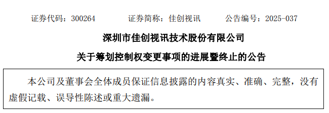 筹划控制权变更事项两个多月的佳创视讯,突然公告该事项终止。