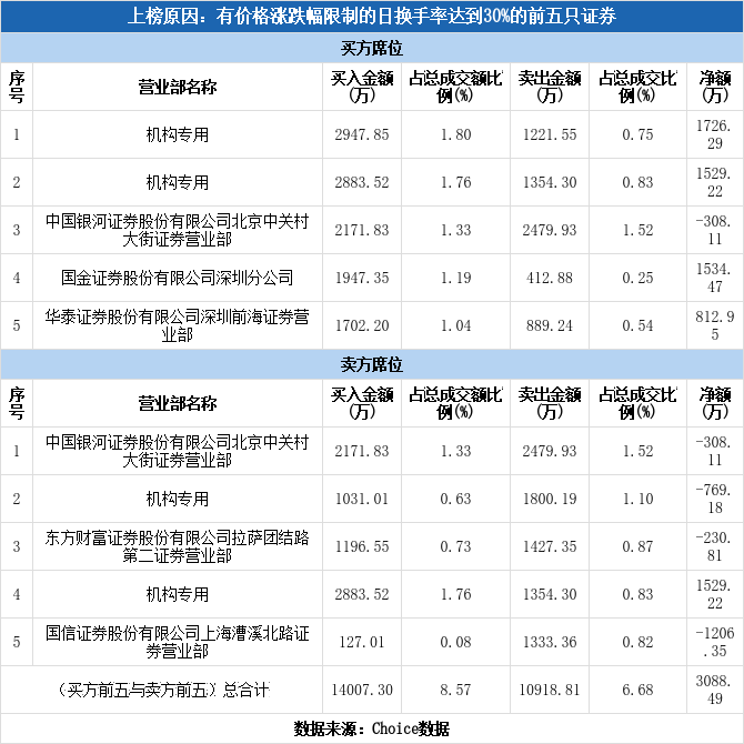 龙虎榜数据显示,今日共4个机构席位出现在龙虎榜单上,分别位列买一、买二、卖二、卖四,合计净买入2486.34万元,占龙虎榜净买额的80.5%。除此之外还有航天发展、和而泰、初灵信息等31只个股榜单上出现了机构的身影,其中17家呈现机构净买入,获净买入最多的是和而泰,净买额为3.30亿元;14家呈现机构净卖出,其中遭净卖出最高的为航天发展,净卖额为3.64亿元。