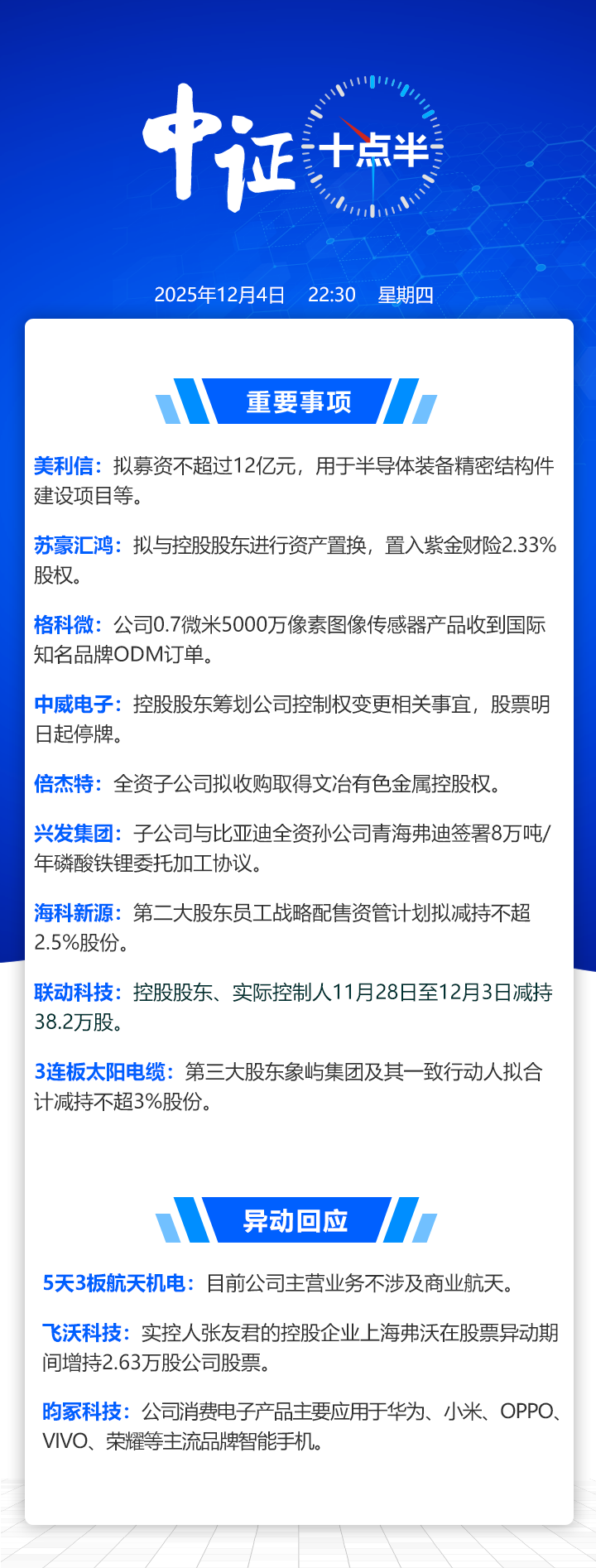 【中证十点半】中威电子控制权或变更;苏豪汇鸿拟置入紫金财险2.33%股权;5天3板航天机电回应