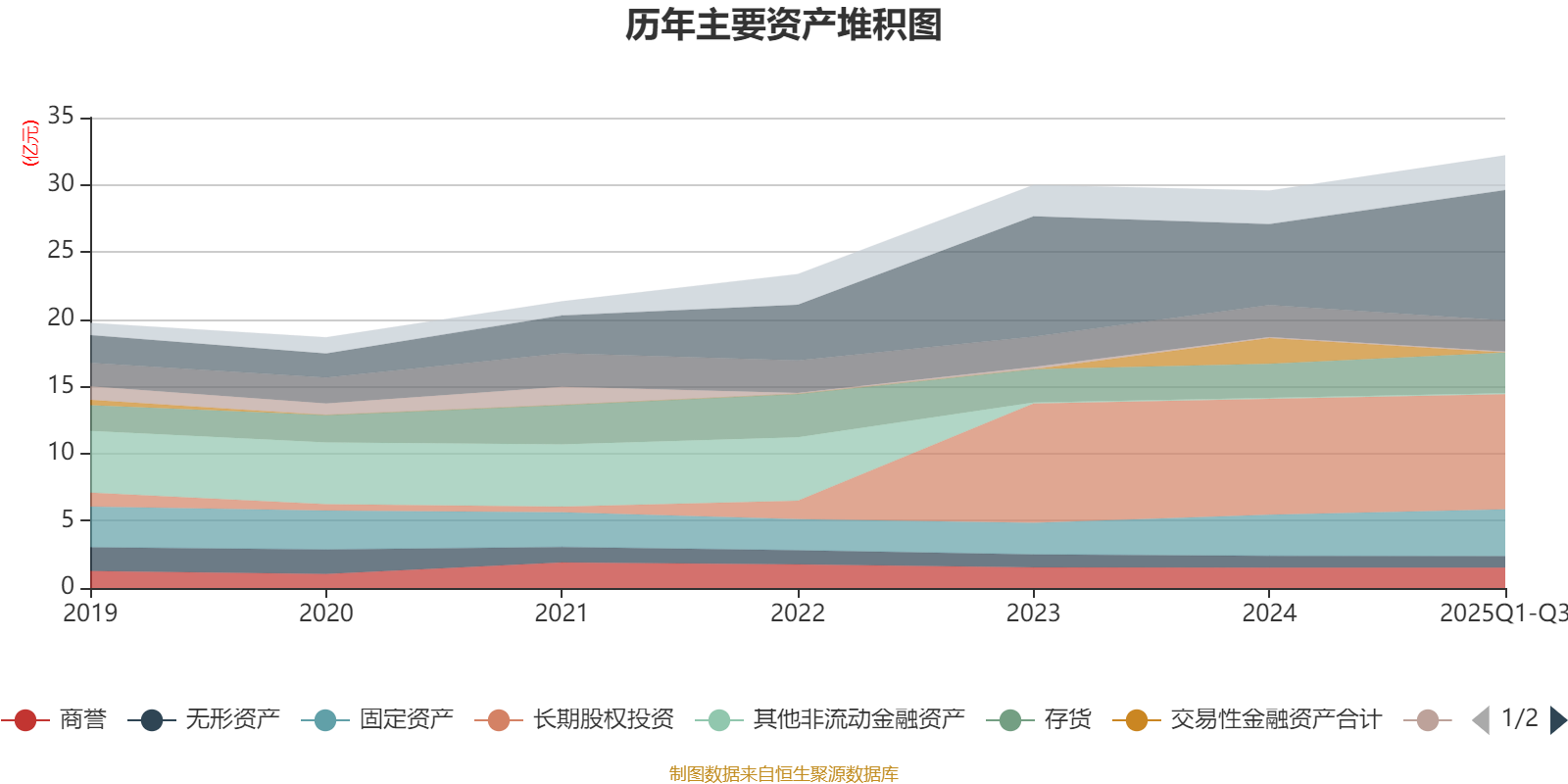 资产重大变化方面,截至2025年三季度末,公司货币资金较上年末增加60.95%,占公司总资产比重上升9.75个百分点;交易性金融资产合计较上年末减少100%,占公司总资产比重下降6.43个百分点;长期股权投资较上年末减少0.85%,占公司总资产比重下降2.61个百分点;应收票据及应收账款较上年末减少2.75%,占公司总资产比重下降0.86个百分点。