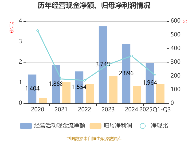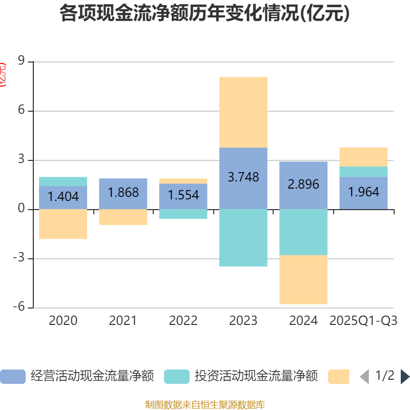 2025年前三季度,公司经营活动现金流净额为1.96亿元,同比下降7.69%;筹资活动现金流净额1.16亿元,同比增加2.29亿元;投资活动现金流净额6315.98万元,上年同期为-5718.4万元。