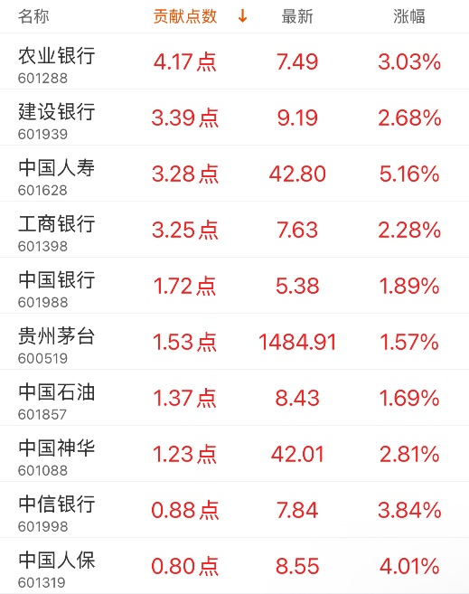 对上证指数贡献点数最多的个股是农业银行,贡献4.17点,该股当日涨3.03%,收盘价7.49元;拖累点数最多的个股是海光信息,拖累0.95点,该股当日跌3.34%,收盘价233.01元。