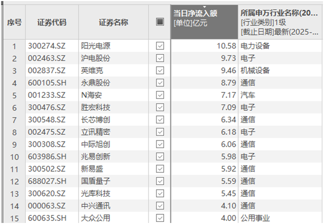 上证报中国证券网讯(记者徐蔚)Choice数据显示,11月25日,当日资金净流入额排名居前个股包括阳光电源、沪电股份、英维克、永鼎股份、胜宏科技等,净流入额均超7亿元。其中,沪电股份、永鼎股份、胜宏科技等属于电子或通信板块。