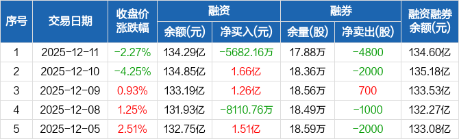 阳光电源融资融券信息显示,2025年12月11日融资净偿还5682.16万元;融资余额134.29亿元,较前一日下降0.42%。