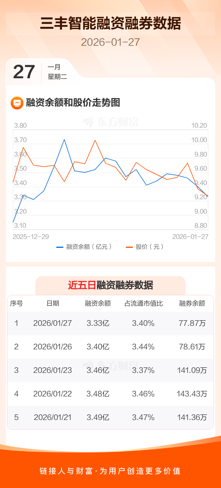 交易所最新数据显示,三丰智能于2026年1月27日获融资买入1979.99万元,融资偿还2730.37万元,当日融资净偿还750.38万元。目前,该股融资余额3.33亿,占流通市值比例为3.40%。
