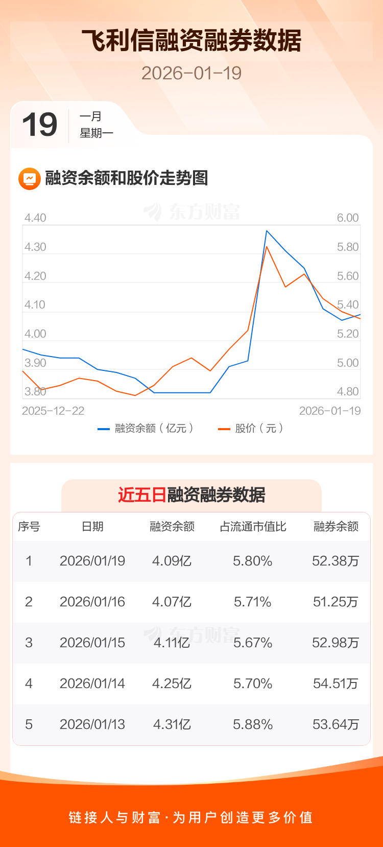 交易所最新数据显示,飞利信于2026年1月19日获融资买入2200.55万元,融资偿还2002.93万元,当日融资净买入197.62万元。目前,该股融资余额4.09亿,占流通市值比例为5.80%。