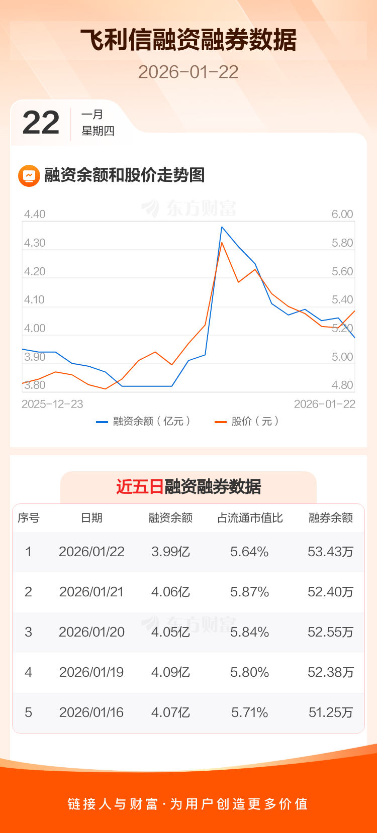 交易所最新数据显示,飞利信于2026年1月22日获融资买入1682.67万元,融资偿还2385.35万元,当日融资净偿还702.68万元。目前,该股融资余额3.99亿,占流通市值比例为5.64%。