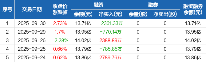 荣科科技:融资净偿还2361.33万元,融资余额13.71亿元(09-30)