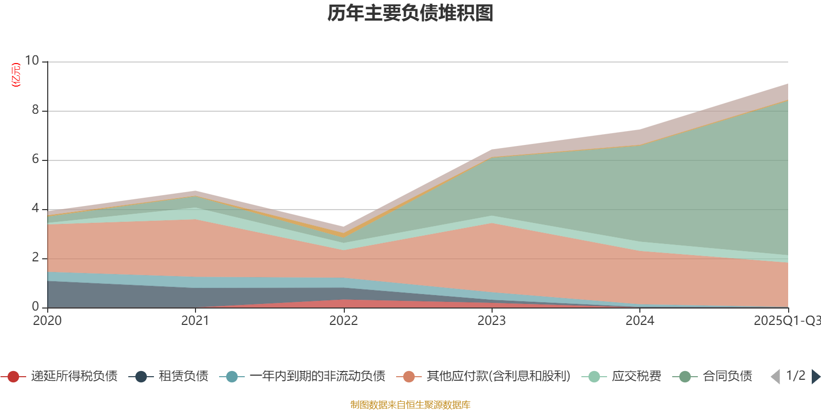 负债重大变化方面,截至2025年三季度末,公司合同负债较上年末增加60.95%,占公司总资产比重上升5.85个百分点;其他应付款(含利息和股利)较上年末减少17.03%,占公司总资产比重下降1.11个百分点;一年内到期的非流动负债较上年末减少91.61%,占公司总资产比重下降0.27个百分点;应交税费较上年末减少19.37%,占公司总资产比重下降0.22个百分点。