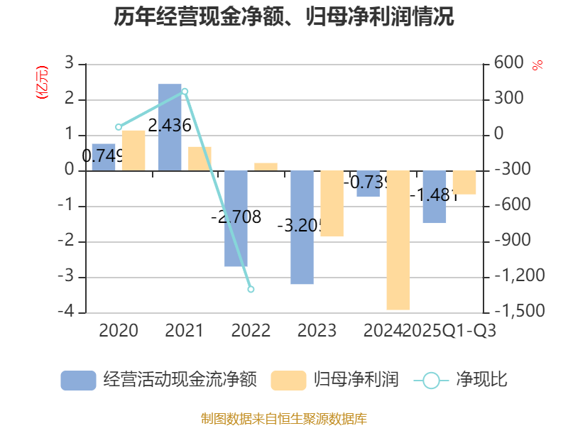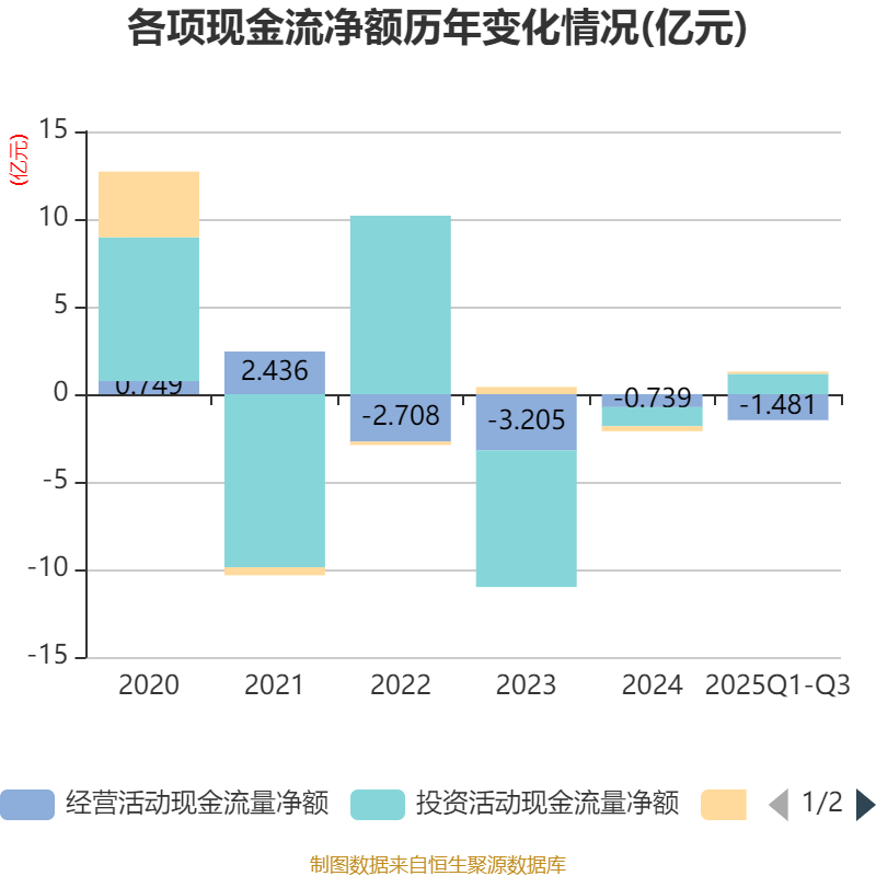 2025年前三季度,公司经营活动现金流净额为-1.48亿元,同比增加5626.71万元;筹资活动现金流净额1262.79万元,同比增加4567.29万元;投资活动现金流净额1.16亿元,上年同期为7325.03万元。