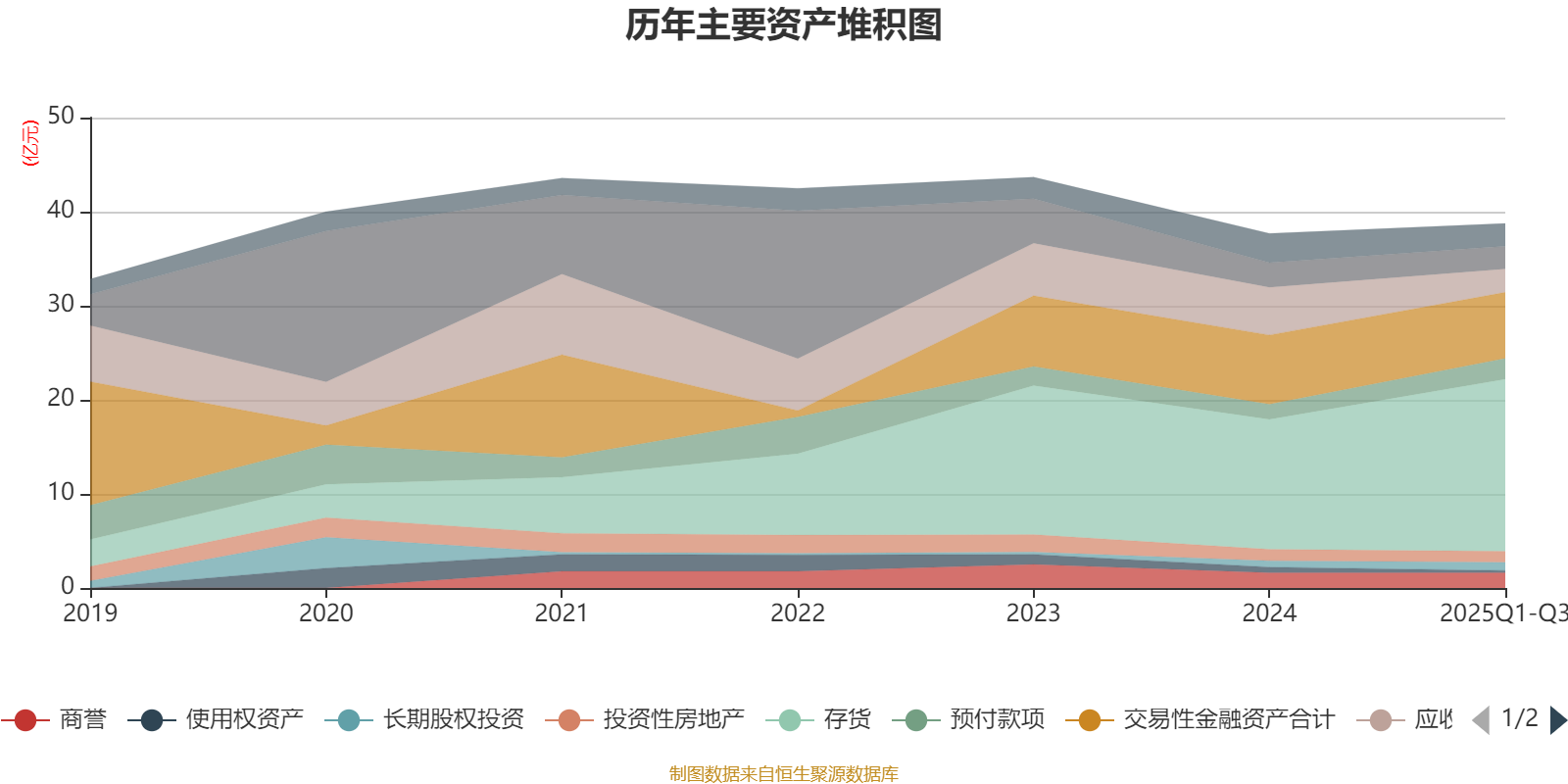 资产重大变化方面,截至2025年三季度末,公司存货较上年末增加32.56%,占公司总资产比重上升10.59个百分点;应收票据及应收账款较上年末减少51.26%,占公司总资产比重下降7.07个百分点;其他流动资产较上年末减少65.34%,占公司总资产比重下降2.55个百分点;预付款项较上年末增加37.42%,占公司总资产比重上升1.44个百分点。