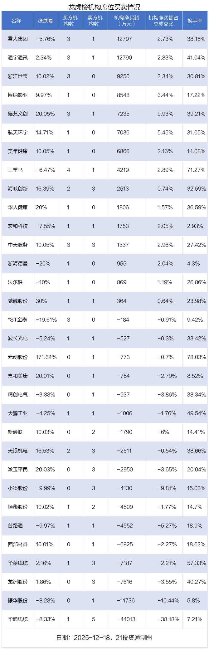 12月18日,32只个股龙虎榜出现了机构的身影,机构合计净卖出2.38亿元。具体来看,机构净买入15股,净卖出17股。