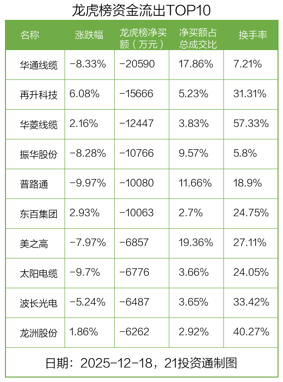 而龙虎榜中资金净流出最多的是华通线缆(605196.SH),被净卖出为2.06亿元,占总成交金额的17.86%。华通线缆收盘下跌8.33%,换手率为7.21%。