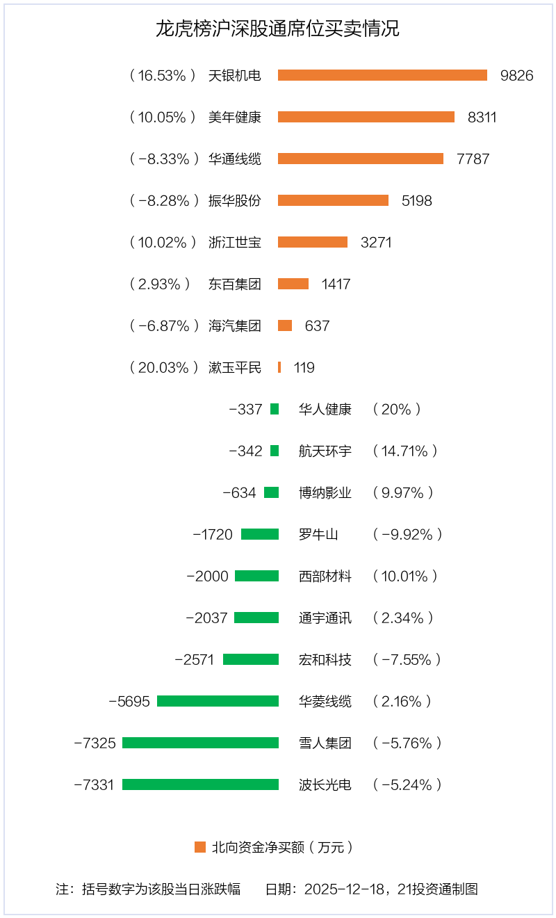 12月18日,北向资金参与龙虎榜中的个股共有18只,合计净买入6574.4万元。其中沪股通净买入4 股,净卖出2 股,合计净买入1.21亿元;深股通净买入4 股,净卖出8 股,合计净卖出5550.73万元。