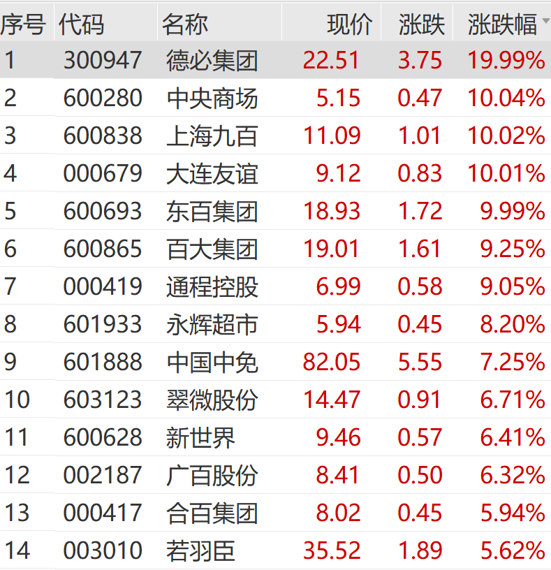 个股方面,德必集团实现20cm涨停,中央商场4天3板,上海九百2连板,大连友谊、东百集团等多股涨停。