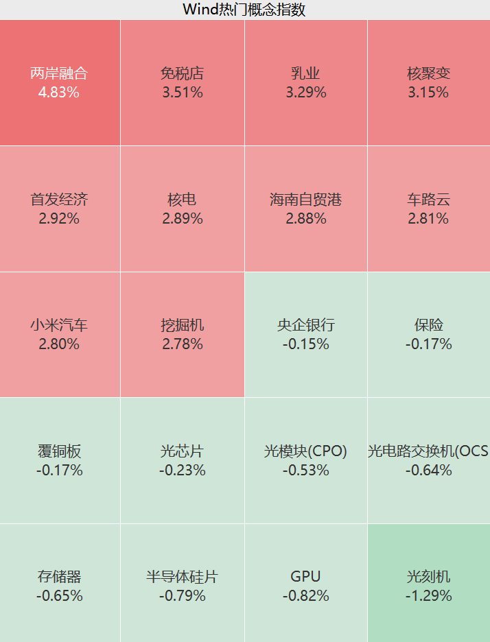 盘面上,上午零售板块领涨市场,两岸融合、免税店、核聚变、车路云等概念股走强,光刻机、光芯片等概念股回调。