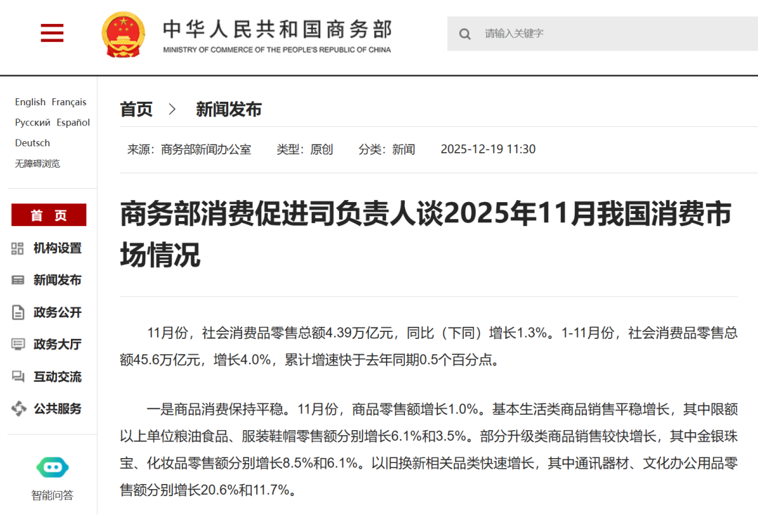 12月19日,商务部消费促进司负责人介绍了2025年11月我国消费市场情况。