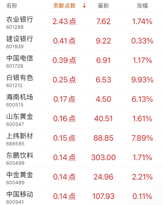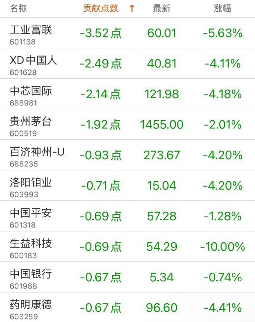 对上证指数贡献点数最多的个股是农业银行,贡献2.43点,该股当日涨1.74%,收盘价7.62元;拖累点数最多的个股是工业富联,拖累3.52点,该股当日跌5.63%,收盘价60.01元。