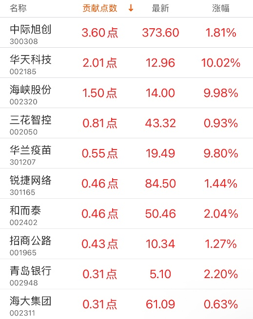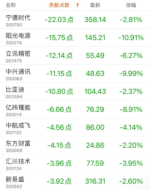 对深证成指贡献点数最多的个股是中际旭创,贡献3.6点,该股当日涨1.81%,收盘价373.6元;拖累点数最多的个股是宁德时代,拖累22.03点,该股当日跌2.81%,收盘价358.14元。