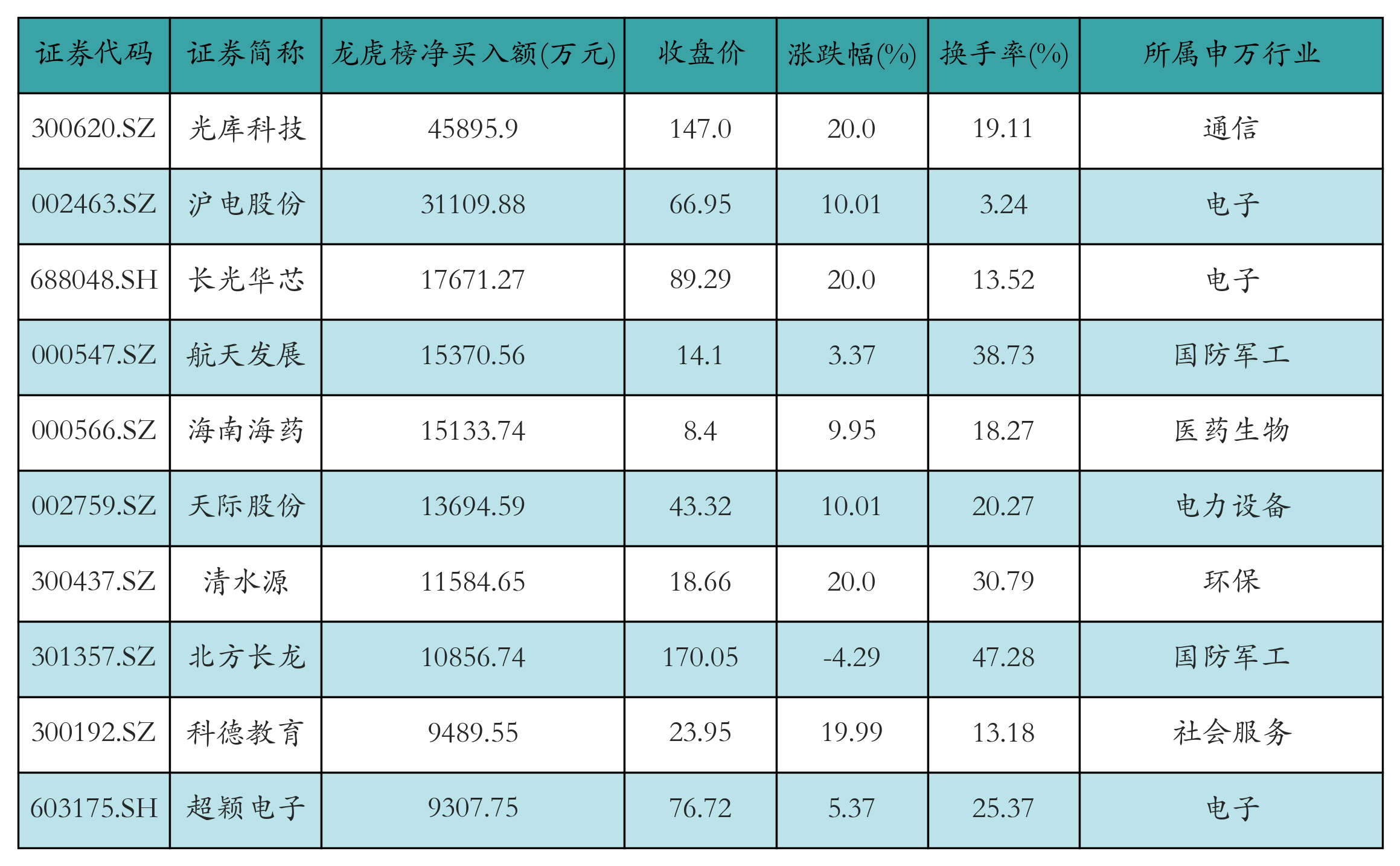 昨日龙虎榜营业部净买入额前10详情见下表: