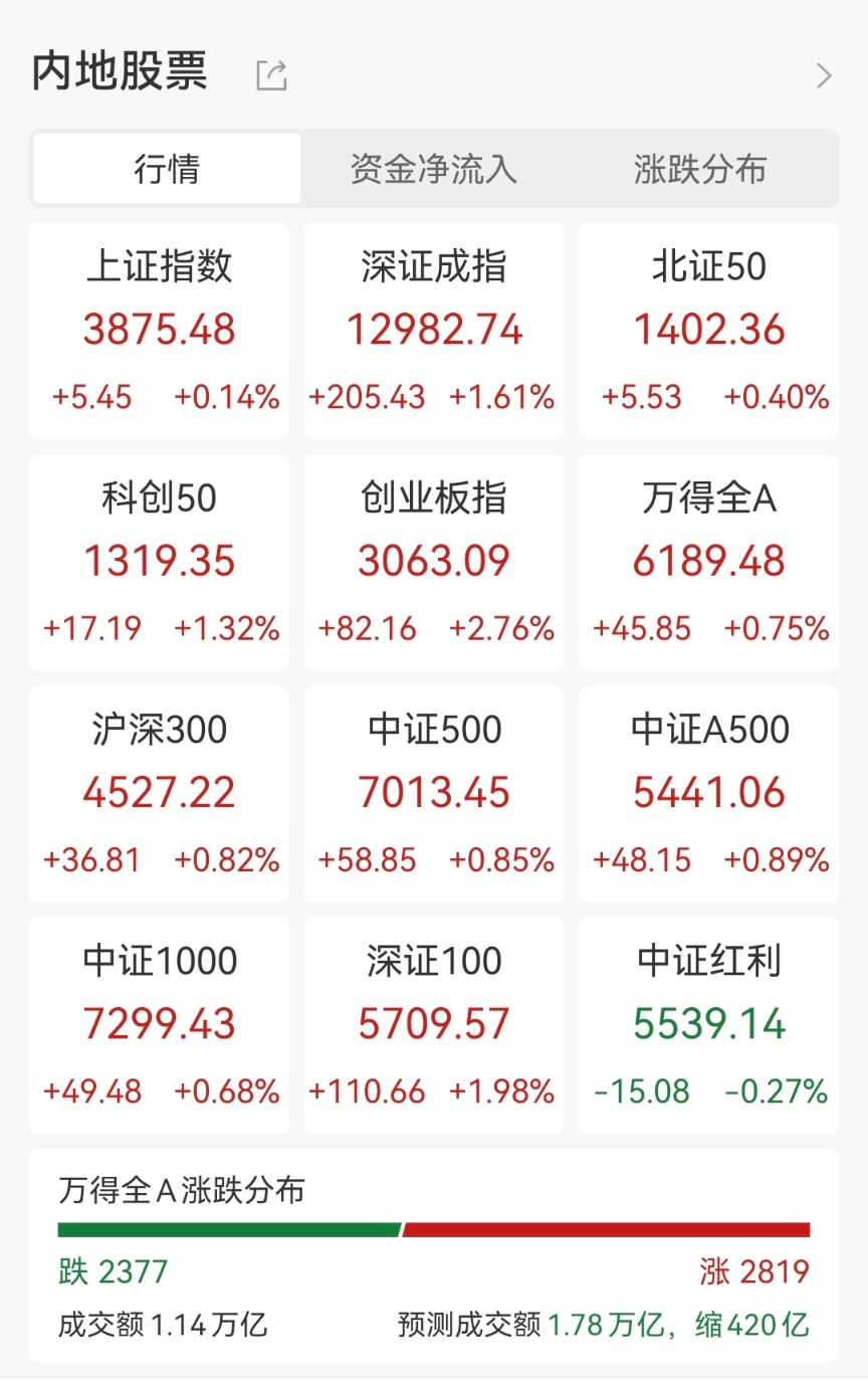 沪深两市半日成交额1.14万亿,较上个交易日缩量420亿。盘面上热点快速轮动,全市场超2800只个股上涨。