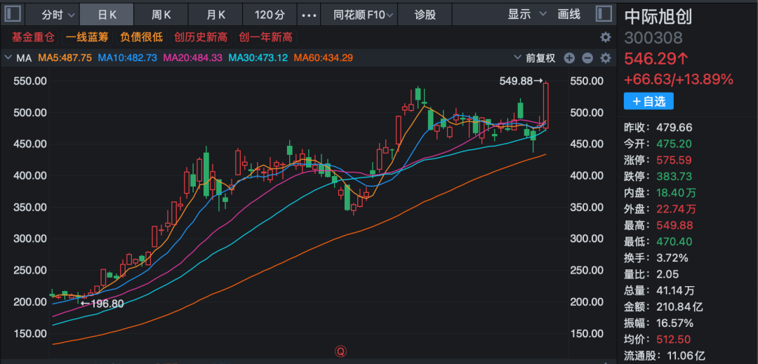 通信设备概念股继昨日大涨后,今日继续上涨,板块指数放量飙升近7%。特发信息再度涨停,连续第4日封板,创5年多新高;中际旭创涨近14%,股价创历史新高,总市值超过6000亿元;新易盛、永鼎股份等涨幅居前。