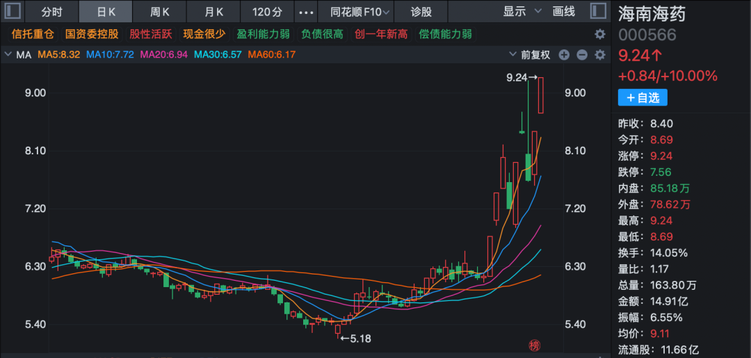 医药股早间全线走强,化学制药、创新药、仿制药、免疫治疗等细分板块近3日纷纷连续高开高走。海南海药开盘仅约5分钟强势涨停,近9个交易日5度涨停,股价创近5年新高;悦康药业、福元医药等也涨停或涨超10%。