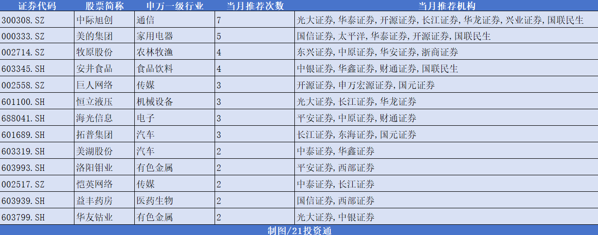 在统计的30余家券商12月金股中,中际旭创获7次推荐,美的集团紧随其后被“点名次数”也达5次,牧原股份、安井食品、巨人网络、海光信息等股也被多次提及。
