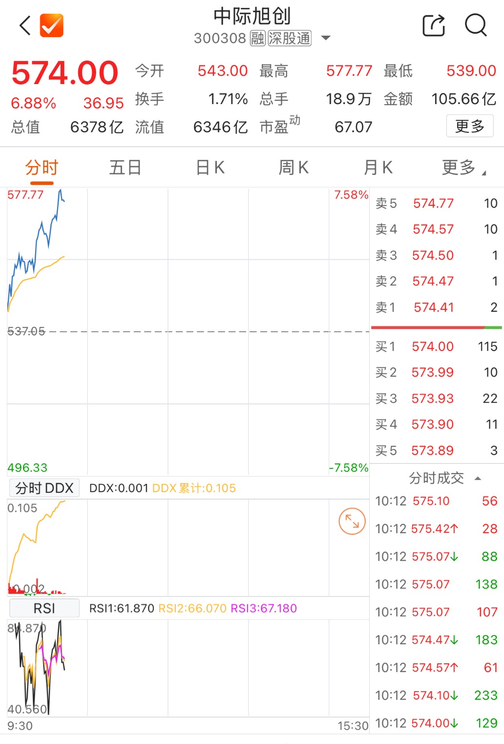 上证报中国证券网讯 12月8日,中际旭创成交额超100亿元,截至10时12分,该股涨近7%,成交额达105亿元。