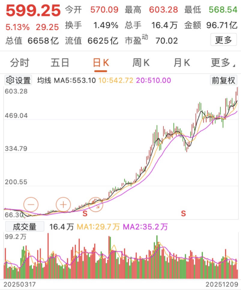 今年开年,受到海外贸易摩擦、出口链悲观情绪的影响,中际旭创的股价一度从高位连续回调,4月9日最低跌到约66.30元,市值不足750亿元。随着CPO、800G光模块行情的全面爆发,公司股价一路狂飙,到12月9日盘中最高冲到了603.28元/股,市值也超过了6600亿元。以2025年1月初到12月8日收盘价570元/股计算,年内涨幅约为370.26%,从区间数据来看,8月8日到12月8日,股价在208.9元-570元的区间中震荡,波动较大。目前来看,其滚动市盈率已经超过70倍,市值进入全A股前二十名行列。