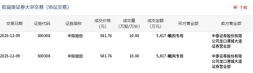 中际旭创今日大宗交易折价成交20万股,成交额1.16亿元