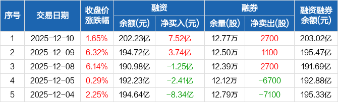 中际旭创融资融券信息显示,2025年12月10日融资净买入7.52亿元;融资余额202.23亿元,较前一日增加3.86%。