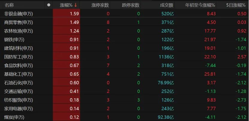板块显著分化,非银金融、商贸零售、农林牧渔、钢铁、建筑材料、食品饮料等收涨。