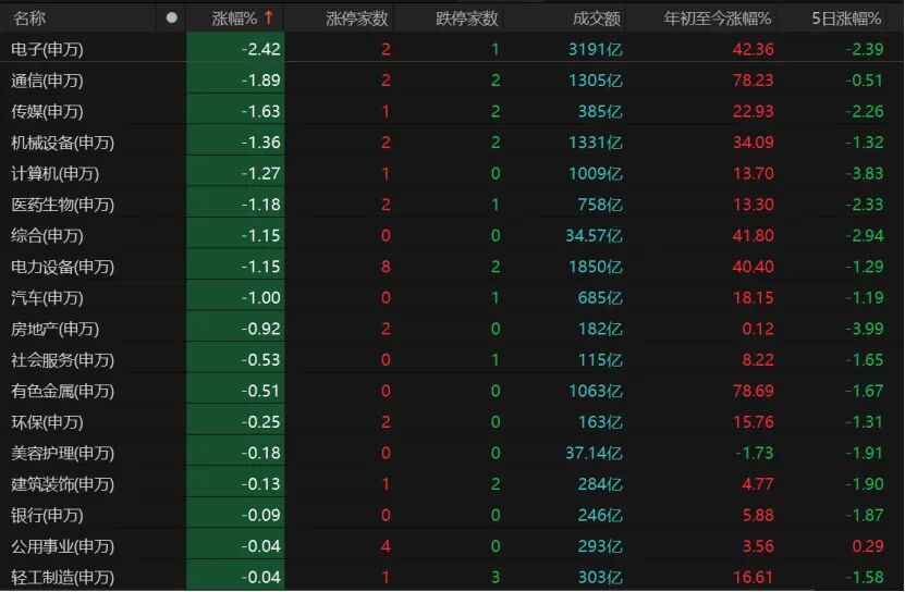 电子、通信、传媒、机械设备、计算机、医药生物、电力设备等板块跌幅均超过1%。但东方日升、昇辉科技两只电力设备个股“20cm”涨停。