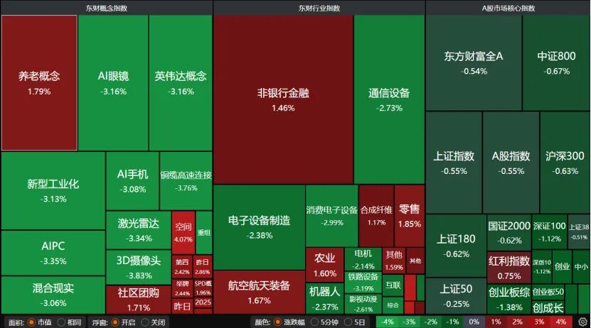 盘面上,热门技术股大跌。AI眼镜、AI手机、AIPC、电子设备制造、消费电子设备、通信设备、机器人、英伟达概念均大跌。零售、农业等大消费方向收红,非银金融继续抬头。