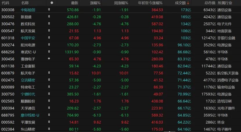 个股涨跌互现,市场仅有2314只个股收涨,涨停股65只;2968只个股收跌,跌停股24只。仅5只个股日成交额超过100亿元,中际旭创收跌1.91%报570.86元/股,新易盛微跌,胜宏科技跌近5%。航天发展收涨1.13%报21.55元/股,中国平安收涨4.96%报67.08元/股。
