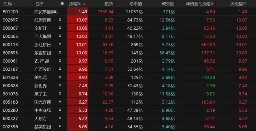 8只商贸零售个股收涨,红旗连锁、全新好、百大集团、浙江东日、东百集团、农产品、广百股份、美凯龙涨停。