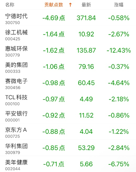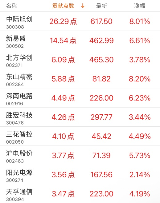 对深证成指贡献点数最多的个股是中际旭创,贡献26.29点,该股当日涨8.01%,收盘价617.5元;拖累点数最多的个股是宁德时代,拖累4.69点,该股当日跌0.58%,收盘价371.84元。