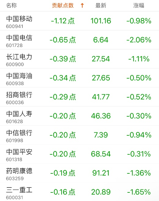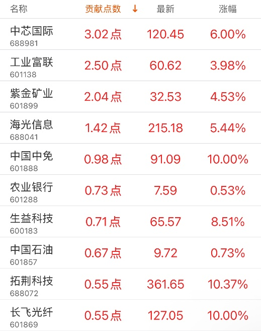 对上证指数贡献点数最多的个股是中芯国际,贡献3.02点,该股当日涨6.00%,收盘价120.45元;拖累点数最多的个股是中国移动,拖累1.12点,该股当日跌0.98%,收盘价101.16元。