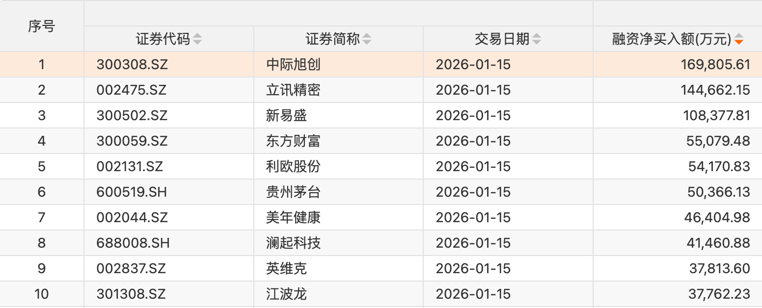 个股方面,73只个股获融资净买入额超1亿元。中际旭创获融资净买入额居首,净买入16.98亿元;融资净买入额居前的还有立讯精密、新易盛、东方财富、利欧股份、贵州茅台、美年健康、澜起科技、英维克、江波龙等。