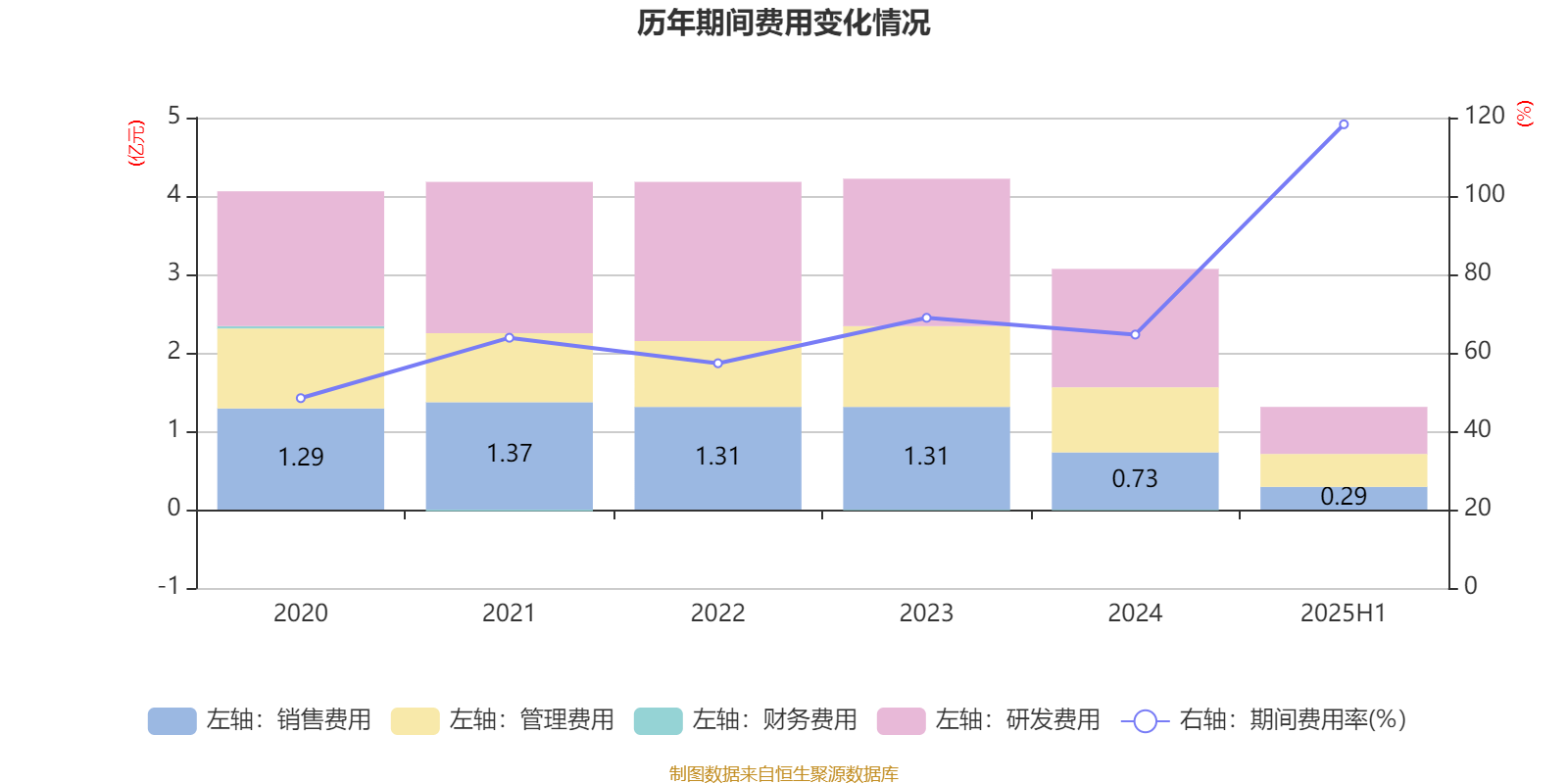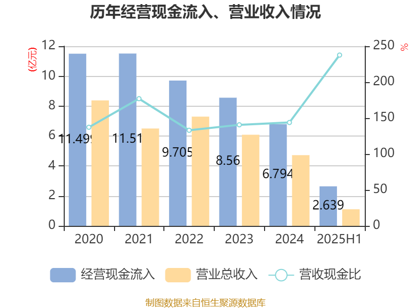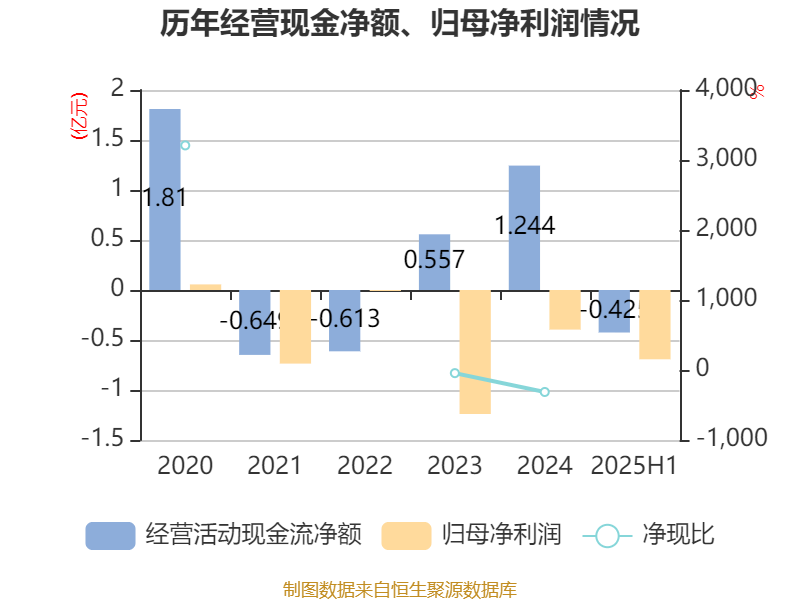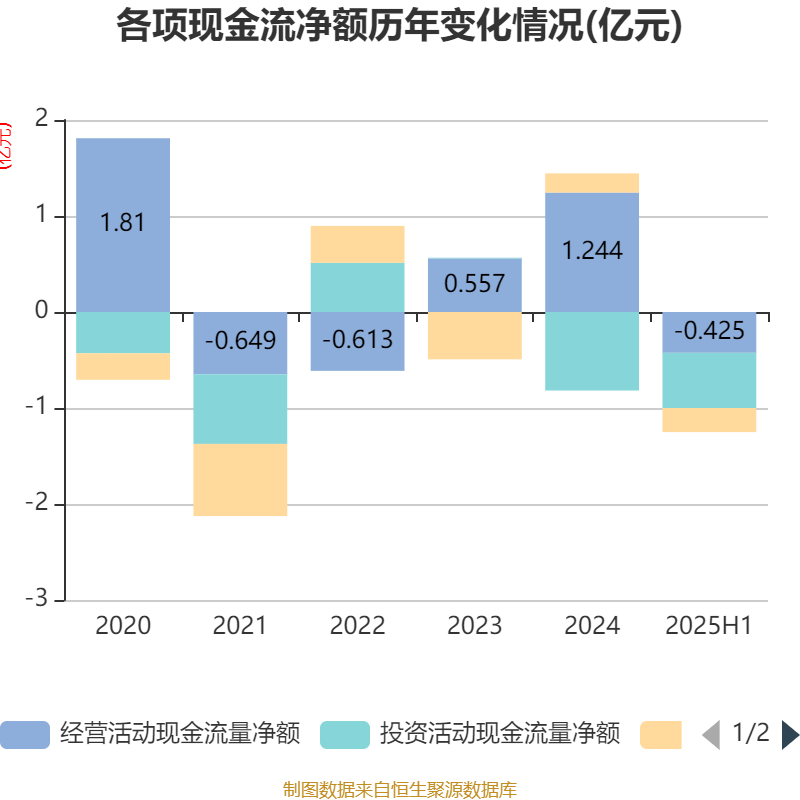 2025年上半年,公司经营活动现金流净额为-4254.13万元,同比增加4130.26万元;筹资活动现金流净额-2505.09万元,同比减少5085.12万元;投资活动现金流净额-5747.48万元,上年同期为1138.45万元。