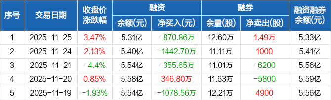 融资方面,当日融资买入4830.13万元,融资偿还5700.99万元,融资净偿还870.86万元,连续3日净偿还累计2669.21万元。融券方面,融券卖出1.6万股,融券偿还1100股,融券余量12.6万股,融券余额150.32万元。融资融券余额合计5.33亿元。
