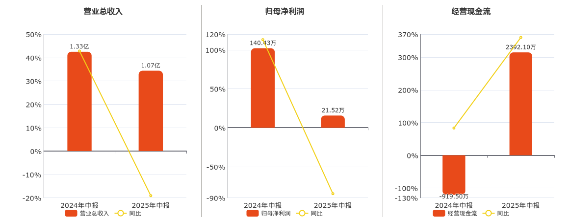 公司营业总收入为1.07亿元,较去年同报告期营业总收入减少2531.34万元,较去年同期下降19.07%。归母净利润为21.52万元,较去年同报告期归母净利润减少118.91万元,较去年同期下降84.68%。经营活动现金净流入为2392.10万元,较去年同报告期经营活动现金净流入增加3311.60万元,实现2年连续上涨。