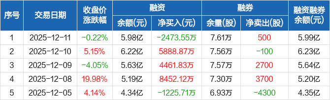 融资方面,当日融资买入2.09亿元,融资偿还2.34亿元,融资净偿还2473.55万元。融券方面,融券卖出700股,融券偿还200股,融券余量7.61万股,融券余额103.95万元。融资融券余额合计5.99亿元。