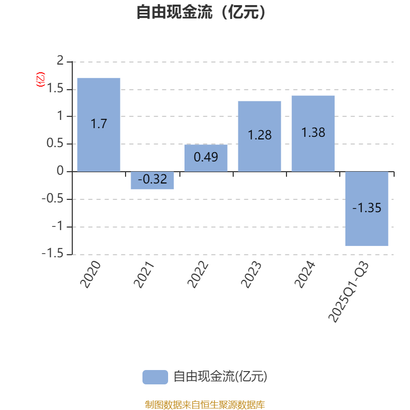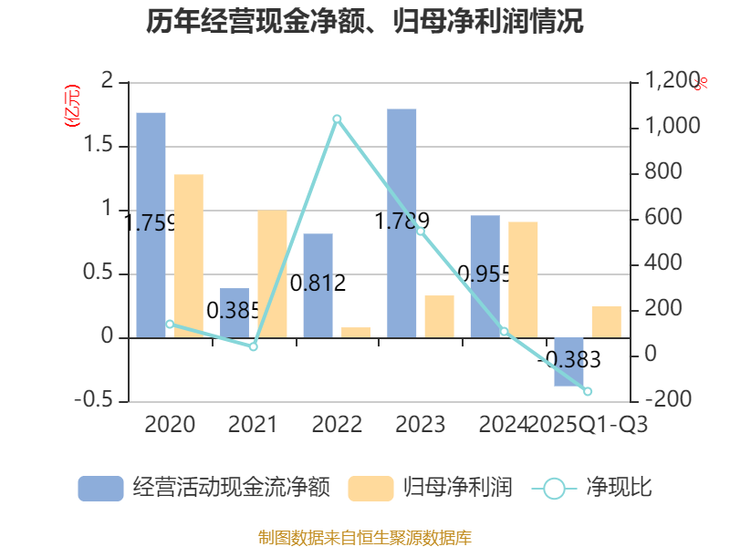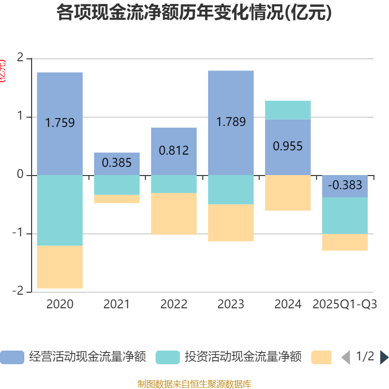 2025年前三季度,公司经营活动现金流净额为-3827.09万元,同比减少6221.77万元;筹资活动现金流净额-2861.7万元,同比增加2072.87万元;投资活动现金流净额-6269万元,上年同期为-4619.31万元。