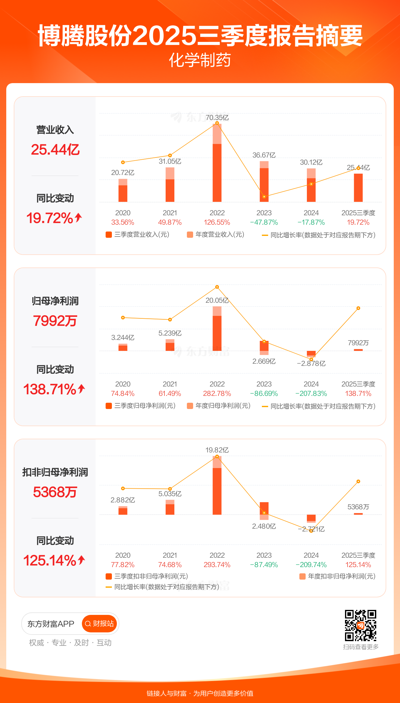 博腾股份10月25日发布2025年三季报显示,公司前三季实现营业收入25.44亿元,同比增长19.72%;归母净利润7991.54万元,同比增长138.71%;扣非归母净利润5367.88万元,同比增长125.14%。